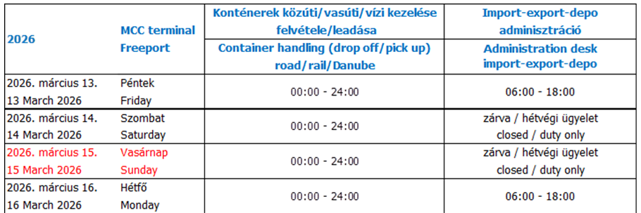 2026. március 15-én, vasárnap a közúti és a vasúti kiszolgálás folyamatos a terminálon, konténer leadás és felvétel lehetséges, amennyiben arról az adminisztráció felé legkésőbb péntek este 6-ig rendelkeznek.