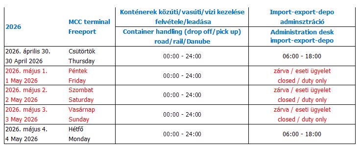 A május 1. ünnepnaphoz kapcsolódó hosszú hétvégén a közúti és vasúti kiszolgálás folyamatos a terminálon, konténer leadás és felvétel lehetséges, amennyiben arról az adminisztráció felé legkésőbb csütörtök este 6-ig rendelkeznek.